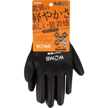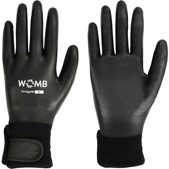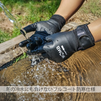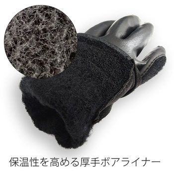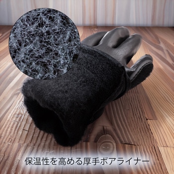 背抜きの甲側をコートする製法で、フィット感と防水性を兼備しています。水や土、油を防ぐウレタン素材のフルコート形状です。裏側は厚手ボアライナーで、温かさを保ちます。袖口のベルクロで、フィット性と防寒性を向上しています。菌の繁殖を抑制し、汗などによるニオイを防ぐサニタイズ抗菌抑臭加工を施しています。EN ISO374-5ウイルス防護基準に準拠しており、ウイルスや菌類の侵入を防ぐ高い防護性能があります。