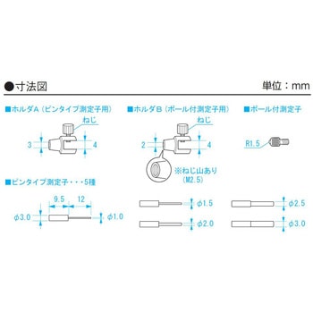 用途・ノギスの外側用ジョウに取付、凹部の測定に付属品ホルダA、ホルダB、ボール付測定子、ピンタイプ測定子x5材質●ピンタイプ測定子:ステンレス●ボール付測定子先端:超硬●ホルダ:アルミ厚さ(mm)取付可能ジョウ:最大3.9本体質量(g)11RoHS指令(10物質対応)対応内容量1個