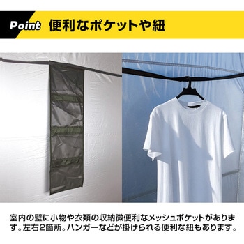 室内にはハンガーなどが掛けられる便利な紐があります。メッシュポケットもあり、小物や着替えなど使い方自由。