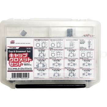 セット内容:グロメット10種×5個、バルブキャップ5種×5個、耐熱コア×5個。乗用車金属バルブ用の一般的なグロメット(パッキン)、無くしがちなバルブキャップ、バルブコアのセット。