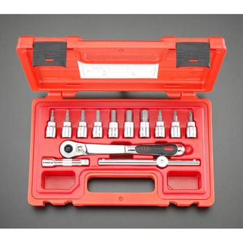 セット点数:13点。セット内容:(+)ビットソケット #1、#2、#3、ヘックスビットソケット 3、4、5、6、8、10、12mm、エクステンションバー75mm、ラチェットハンドル205mm、ヘッド幅29.1mm、ヘッド厚12.0mm。スライドハンドル。ケース付き。