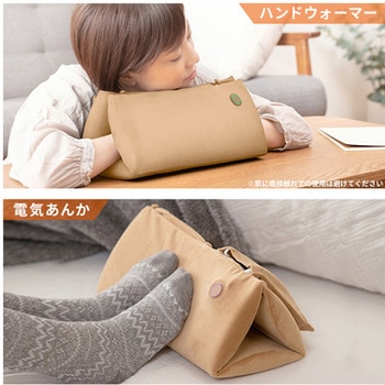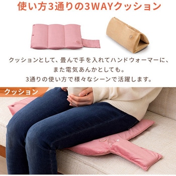 パソコンのUSBポートやモバイルバッテリーからの給電が可能で、オフィスでの使用やテレワーク時のデスクなど様々なシーンで活躍する3wayヒートクッションです。クッション・ハンドウォーマー・電気ゆたんぽの3way仕様。熱伝導性の高いカーボンナノチューブを採用。強度に優れており、軽く柔らかい触り心地です。収納ポーチ付きで、どこにでもコンパクトに持ち運べます。クッション本体は洗濯可能なので、もし汚れても安心。常に清潔を保てます。モバイルバッテリー収納ポケット付きです(※モバイルバッテリーは付属されていません)。触り心地の良いベロア素材です。使い方:コントローラーのある面を上にして、平らなところに置いて使用してください。あたたかさと使用時間の目安 レベル4(赤/高温):約6時間 レベル3(紫):約9時間 レベル2(緑):約13時間 レベル1(白/低温):約20時間、給電ケーブル:電源コードの長さ/1000mm、入力ポート/USB Type-A。
