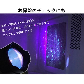 ベルトクリップ付き。高性能UV-LED搭載で被照射体へのUV反応をはっきり確認できます。ライトヘッドを前後にスライドさせることで、照射範囲を拡大・縮小させることができます。ほこりや、水回り・油汚れ、トイレの尿はねのチェックなどにもお使いいただけます。