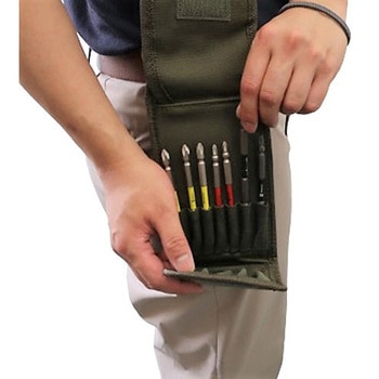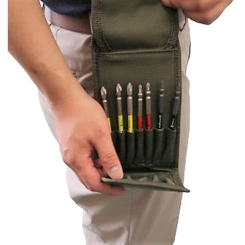 ドリル収納ポケットは伸縮性のある生地を使用しています。フラップ式のフタ付で収納したドリルなどの落下や紛失を防ぎます。ベルトに通す・お尻ポケットに差し込む・カラビナなどに通すなど3ウェイで使用できます。ベルト通しは面ファスナー(マジックテープ)仕様の為、着脱が簡単です。ロングドリル全長:約150mmまで、ショートドリル全長:約70mmまで収納可能。収納本数 ロングドリル7本、ショートドリル5本。