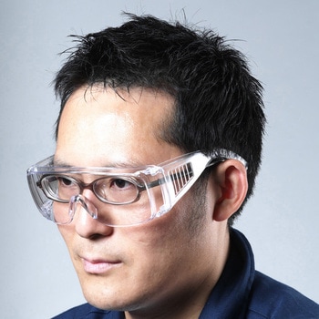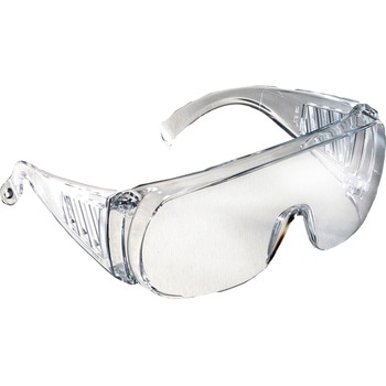ポリカーボネートレンズ。99.9%UVカット(サイド部分も含む)。サイドに通気孔付き。吊穴付き。メガネの上から装着可能。ANSI規格 Z87.1+適合。めがねサイズ A:140mm、B:130mm、C:80mm、D:50×70mm。