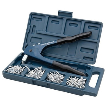 セット内容: ハンドリベット、リベット(リベット径:3.2×8mm、板厚:2.5~3.5mm)×50本、リベット(リベット径:4×10mm、板厚:5.5~7.5mm)×60本、リベット(リベット径:4.8×10mm、板厚:5.5~7.5mm)×20本。