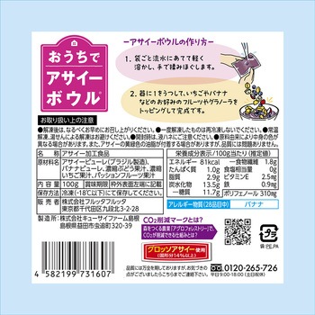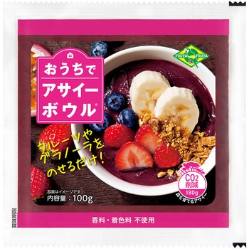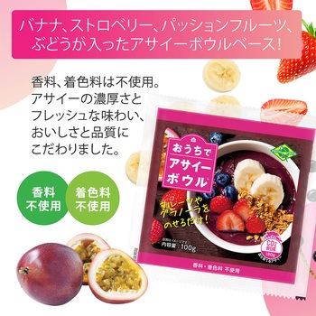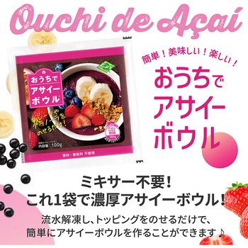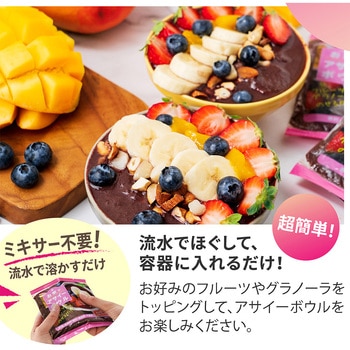 ミキサー要らずで手軽に簡単にアサイーボウル がつくれます。アサイーピューレにバナナやいちごなどのフルーツをオールインワンでミックスした冷凍パック。パッケージごと流水にあてながら揉みほぐすだけで好きなテクスチャーでお召し上がりいただけます。