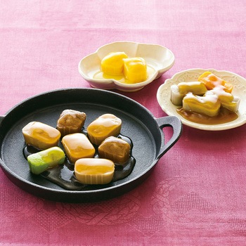 高栄養美味しさ簡便性にこだわったムース食のセットです。主菜1品副菜2品を組み合わせた昼夜向けのメニューです。トレイごと手軽に調理提供できます。主菜:すき焼き(牛肉椎茸いんげんのムース)/副菜(大):きんぴらごぼう(ごぼうにんじんのムース)/副菜(小):かぼちゃのオレンジ煮(かぼちゃのムース)