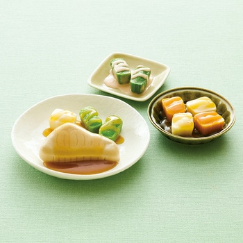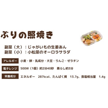 高栄養美味しさ簡便性にこだわったムース食のセットです。主菜1品副菜2品を組み合わせた昼夜向けのメニューです。トレイごと手軽に調理提供できます。主菜:ぶりの照り焼き(ぶりいんげん大根のムース)/副菜(大):じゃがいもの生姜あん(じゃがいもにんじんのムース)/副菜(小):小松菜のオーロラサラダ(小松菜のムース)