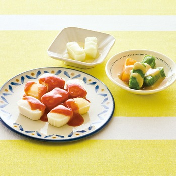 高栄養美味しさ簡便性にこだわったムース食のセットです。主菜1品副菜2品を組み合わせた昼夜向けのメニューです。トレイごと手軽に調理提供できます。主菜:チキンのトマト煮(鶏肉じゃがいもたまねぎのムース)/副菜(大):小松菜のごま和え(小松菜にんじんのムース)/副菜(小):キャベツのコンソメ煮(キャベツのムース)