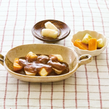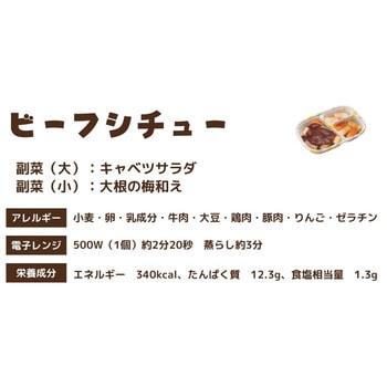 高栄養美味しさ簡便性にこだわったムース食のセットです。主菜1品副菜2品を組み合わせた昼夜向けのメニューです。トレイごと手軽に調理提供できます。主菜:ビーフシチュー(牛肉じゃがいもたまねぎにんじんのムース)/副菜(大):キャベツサラダ(キャベツにんじんのムース)/副菜(小):大根の梅和え(大根のムース)