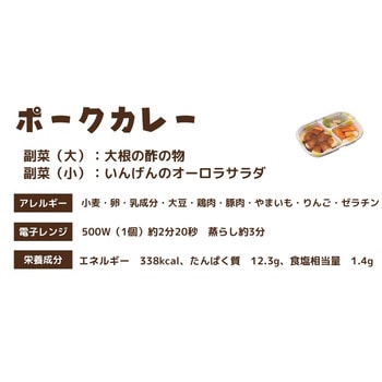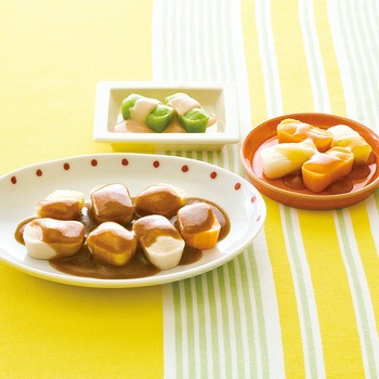 高栄養美味しさ簡便性にこだわったムース食のセットです。主菜1品副菜2品を組み合わせた昼夜向けのメニューです。トレイごと手軽に調理提供できます。主菜:ポークカレー(豚肉じゃがいもたまねぎにんじんのムース)/副菜(大):大根の酢の物(大根にんじんのムース)/副菜(小):いんげんのオーロラサラダ(いんげんのムース)