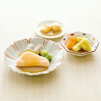 高栄養美味しさ簡便性にこだわったムース食のセットです。主菜1品副菜2品を組み合わせた昼夜向けのメニューです。トレイごと手軽に調理提供できます。主菜:赤魚のおろし煮(赤魚ごぼういんげんのムース)/副菜(大):キャベツの柚子味噌和え(キャベツにんじんのムース)/副菜(小):大根のごまサラダ(大根のムース)
