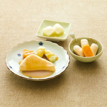 高栄養美味しさ簡便性にこだわったムース食のセットです。主菜1品副菜2品を組み合わせた昼夜向けのメニューです。トレイごと手軽に調理提供できます。主菜:鮭のちゃんちゃん焼き(銀鮭キャベツにんじんのムース)/副菜(大):れんこんの梅和え(れんこんにんじんのムース)/副菜(小):大根のコンソメ煮(大根のムース)