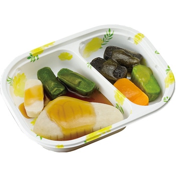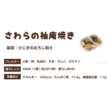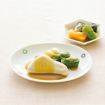 高栄養美味しさ簡便性にこだわったムース食のセットです。主菜1品副菜1品を組み合わせた朝向けのメニューです。トレイごと手軽に調理提供できます。主菜:さわらの柚庵焼き(さわら小松菜れんこんのムース)/副菜:ひじきのおろし和え(ひじきいんげんにんじんのムース)