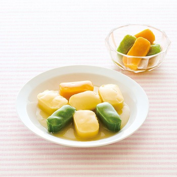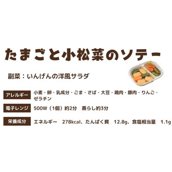 高栄養美味しさ簡便性にこだわったムース食のセットです。主菜1品副菜1品を組み合わせた朝向けのメニューです。トレイごと手軽に調理提供できます。主菜:たまごと小松菜のソテー(たまご小松菜にんじんのムース)/副菜:いんげんの洋風サラダ(いんげんにんじんのムース)