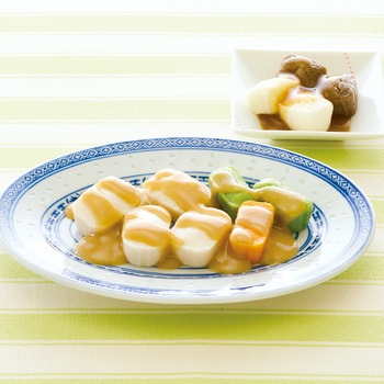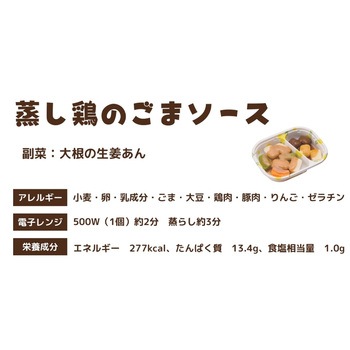 高栄養美味しさ簡便性にこだわったムース食のセットです。主菜1品副菜1品を組み合わせた朝向けのメニューです。トレイごと手軽に調理提供できます。主菜:蒸し鶏のごまソース(鶏肉いんげんにんじんのムース)/副菜:大根の生姜あん(大根椎茸のムース)