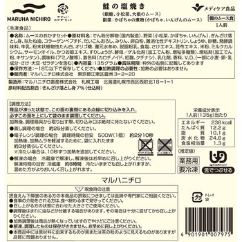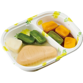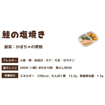 高栄養美味しさ簡便性にこだわったムース食のセットです。主菜1品副菜1品を組み合わせた朝向けのメニューです。トレイごと手軽に調理提供できます。主菜:鮭の塩焼き(銀鮭小松菜大根のムース)/副菜:かぼちゃの煮物(かぼちゃいんげんのムース)
