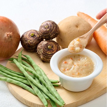 温めてお召し上がりいただく場合は温度を確認してからお子さまにあげてください。月齢は目安です。焦らず段階的にお子さまの食欲や成長にあわせてご利用ください。食べ残しや作り置きは与えないでください。離乳の進め方については専門家にご相談ください。解凍後は再凍結しないでください。解凍後や開封後はお早めにお召し上がりください。
