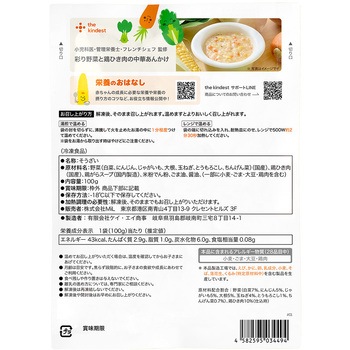 離乳食後期の9~11ヶ月頃から利用できる冷凍ベビーフードです。鶏ひき肉と野菜をまろやかな八宝菜風に。コーンやじゃがいもが入って優しい味わいに。1袋が1食分の目安量です。