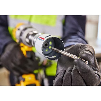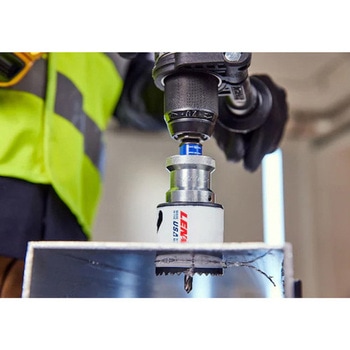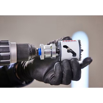 ワンタッチ式アーバー。ホールソーの取付けが素早く簡単にできます。スナップバック式で2ステップで解除設計。センタードリルをワンタッチで交換可能。チャック式回転ドリルに取付き。回転モードで使用。アーバーの設計変更により、従来のセンタードリルは装着することができません。