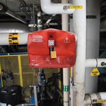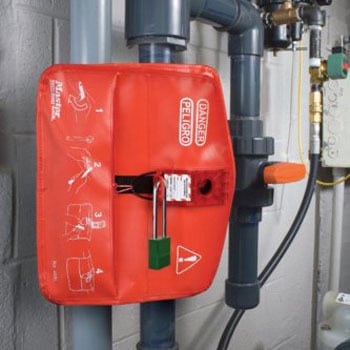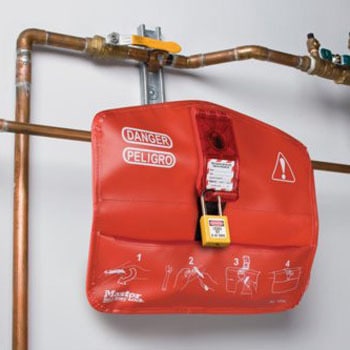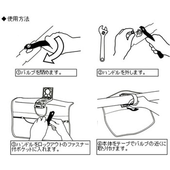 ボールバルブの安全のためのロックアウト。市販の南京錠で施錠します。南京錠は別売です。ハンドルの誤作動でバルブが誤って作動する危険性を排除します。