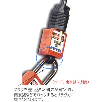 110V、120Vのプラグに適用(アース有/無)。施錠可能。プラグを差し込むと鍵穴がとび出し南京錠などでロックするとプラグが抜けなくなります。南京錠は別売です。