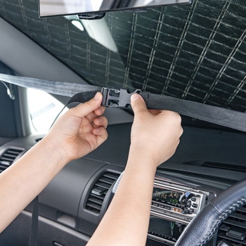 車内側はベルト固定できるので、風などによるめくれを防止でき、しっかりとフロントガラスを守ります。
