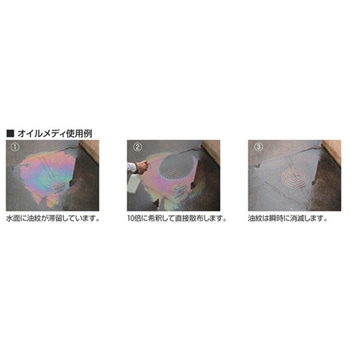 アルコール系石油系の溶剤を一切使用していない完全水系の油処理剤です。乳化タイプの中和剤とは違い、白濁現象を起こしません。また、水系のため消防法上の備蓄制限はありません。油を超微粒子(自然界の微生物が処理できるレベルまで)に加水分解し、かつ一度分解された油は再付着しないため、オイルボールや油紋の発生を抑えます。油を分解するとともに、本液中の特殊栄養剤によって地場の微生物を急速に増殖させ、油分子を水と二酸化炭素に生分解します。長期間(3年以上)保存可能です(ただし保存状態によります)。希釈タイプ(通常10倍)により経済性も高いです。本液体は生分解性99%以上です。環境負荷の少ない陰イオン系界面活性剤を約4%と少量のため、使用時の泡立ちが非常に少ないです。天然植物から抽出した消臭剤を配合しており、鉱物油特有の臭いを抑制します。
