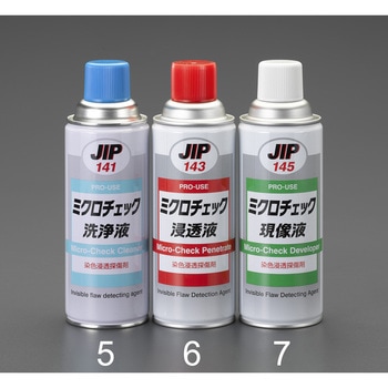 3本組。セット内容:420ml 金属傷探査(洗浄液)、420ml 金属傷探査(浸透液)、420ml 金属傷探査(現像液)、アタッシュケース。自動車のスピンドル、ピストン、化学関係のバルブ装置部品、車輌の車輪、車軸、航空機関係のプロペラ、エンジン部分等にも使用できます。 アルミニウム合金、マグネシウム合金でも腐蝕しません。特殊な装置は一切不要なので、屋内・屋外を問わず使用できます。取り扱いが簡単なので、容易に使用できます。肉眼では発見できない微細な欠陥も鮮明な赤色で指示されますので、容易にキズが発見できて見落としがありません。被検査物の材質や形状、仕上げの如何に拘わらず使用できます(塗装面、プラスチックは除く)。ワンタッチエアゾール式なので、使用が簡単で携帯に便利です。腐食しやすいアルミニウム合金、マグネシウム合金に対しても安全に使用できます。検査結果は拭き取らない限りそのまま保存できます。検査感度はキズ巾1.5μm、深さ30μm【JIS Z 2343-2 準拠】 最高感度の感度レベル2(試験温度範囲-20℃~50℃の結果)。使用方法 染色浸透探傷法(PT)は、赤色浸透液を検査物の表面欠陥部に浸透させた後、洗浄液で余分の赤色浸透液を除去し、白色現像液で毛細管現象を応用して欠陥部に浸透している赤色浸透液を現像発色させ、目で見えない欠陥を発見する方法です。〈有機則|非該当〉健康に有害な54の有機溶剤を含まない(5%以下)の製品。〈PRTR|該当〉※洗浄液・浸透液 環境に有害な化学物質を1%以上含む製品。1t以上(成分換算)の使用で報告義務がある製品。〈PRTR|非該当〉※現像液 環境に有害な化学物質を含まない(1%未満)の製品。