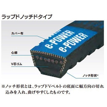 Vベルトの底面に幅方向の切れ込みを入れ曲げやすくしたラップドノッチタイプ。ノッチ形状による屈曲性に優れ、従来の標準Vベルトに比べて曲げによる動力損失が少なく省エネ効果があります(※使用条件やベルト張力によって変化します)。従来のプーリが使用でき、ベルトの交換のみで消費電力を低減できます。急起動時の音が気になる場合や急激に大きな負荷がベルトにかかる場合、省エネ効果を優先したい場合に最適。
