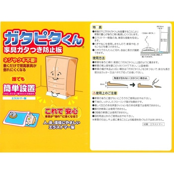 家具の下に「ガタピタくん」を設置することにより、家具の重心が後ろに移り転倒しにくくなります。エラストマー樹脂の為、微弱な振動を吸収します。くぎやねじを使用しませんので、家具や柱、かもいなどを傷つけません。ハサミでかんたんに切れ、自由に長さが調節できます。
