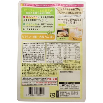 カルシウムビタミン11種類を配合した栄養機能食品の高たんぱくきなこです。体をつくる栄養素を手軽に摂取できます。1日当たり20gを目安におやつや朝食にかけたり牛乳などに混ぜてお召しあがりください。