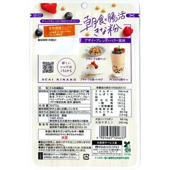 アサイーとベリー系パウダーをブレンドした フルーティーな味わいのきな粉が誕生しました。朝の習慣にぴったりな新しいきな粉です。 アサイーをブレンドしベリー風味の爽やかな味わいに仕上げました。食物繊維とぶどう糖配合で 朝の元気をサポートします。ヨーグルトや牛乳など毎日の朝食にプラスして健康を意識しながら美味しく楽しめる新しいきな粉をぜひお試しください。