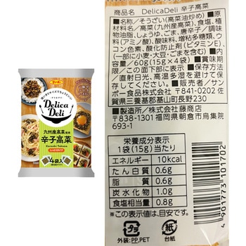 1点のみご購入の場合は、セット商品のみで梱包してお届けします。複数個購入や他の商品と一緒にご購入いただいた場合は、同梱してお届けすることがあります。サンポー食品 DelicaDeli 辛子高菜 60g×5個/サンポー食品 DelicaDeli 柚子胡椒辛子高菜 60g×5個/を詰め合わせております。