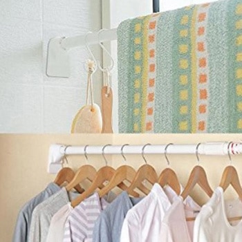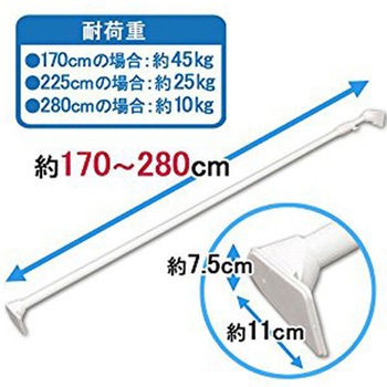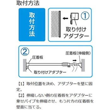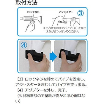 ねじや釘を使わずに壁にしっかりと固定できる伸縮棒です。パイプ先端のL字型圧着部を広くすることで、耐荷重がより強化されました。一人でも簡単に取り付けができるアダプターが1個付いています。取付方法 1.伸縮棒を取り付けたい位置を決め、アダプターを壁に取り付ける。2.アダプターに伸縮棒を乗せる。3.突っ張る。4.アダプターを外し、完了!(※壁紙に両面テープが残っている場合は、水で濡らすと簡単に剥がれます。)。