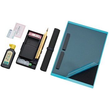 固形墨:煤・膠/ふで思いなぼくてき(180ml):煤・樹脂・PE・PP/筆(太筆・細筆セット):ABS(抗菌軸)・馬毛・羊毛/ぼくちすずり(5.4寸):PP・シリカ系フィラー剤/文鎮二本組:鉄・ABS/下敷:ポリエステル/水差し:PE/かんたん筆巻:不織布(PP)/半紙ばさみ:PP/左右両用中皿:PS/書道バッグ:ポリエステル/書道のてびき:紙/名前シール:紙・PET