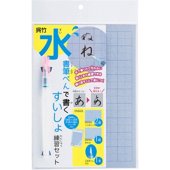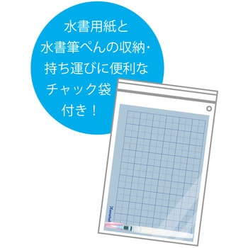 水書用紙のサイズはB5判で、小学校で使用されている教科書と同じサイズです。水書筆ぺん中字1本、練習用紙マス目入り2枚、練習用紙無地1枚入り。水書用紙と水書筆ぺんの収納・持ち運びに便利なチャック袋付き。