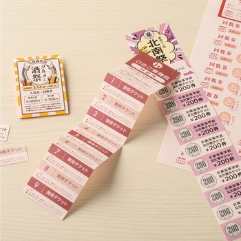 印刷してから切り離すだけ!綴りタイプのチケット・回数券を少量から作成できます。コーヒー・ドリンクチケットやクリーニング・入浴回数券などにおすすめの11枚綴りタイプ。