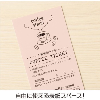 用途印刷してから切り離すだけで、綴りタイプのチケット・回数券を少量から作成できます。コーヒー・ドリンクチケットやクリーニング・入浴回数券、イベントチケットなどにおすすめの11枚綴りタイプ。ミシン目入りなので、手で簡単に切り離せます。また、財布やカードケースに入れやすいコンパクトなサイズに折りたたむこともできます。チケットとチケットの間に余白があるので、隣り合うチケット同士を別のデザインにすることも可能!一番上の表紙スペースは、お店の情報やロゴのほか、イベントの詳細など自由にデザインいただけます。両面印刷が可能で、手書きやスタンプにも対応しています。厚さ(mm)0.15寸法(mm)【チケット】55×288(1片:55×21)入数(枚)10シート(チケット30分)対応【プリンタ】カラーレーザー、モノクロレーザー、カラーコピー、モノクロコピー、インクジェット坪量(g/m2)124面付11枚綴り×3面用紙サイズA4(210×297mm)素材上質紙RoHS指令(10物質対応)対応内容量1袋(10シート)
