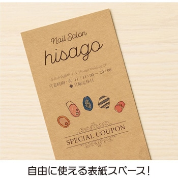 用途印刷してから切り離すだけで、綴りタイプのチケット・回数券を少量から作成できます。ドリンクチケットやレッスンチケット、サロン回数券・施術券、クーポン券などにおすすめの6枚綴りタイプ。ミシン目入りなので、手で簡単に切り離せます。また、財布やカードケースに入れやすいコンパクトなサイズに折りたたむこともできます。チケットとチケットの間に余白があるので、隣り合うチケット同士を別のデザインにすることも可能!一番上の表紙スペースは、お店の情報やロゴのほか、イベントの詳細など自由にデザインいただけます。両面印刷が可能で、手書きやスタンプにも対応しています。厚さ(mm)0.16寸法(mm)【チケット】55×285(1片:55×40)入数(枚)10シート(チケット30分)対応【プリンタ】カラーレーザー、モノクロレーザー、カラーコピー、モノクロコピー、インクジェット坪量(g/m2)100面付6枚綴り×3面用紙サイズA4(210×297mm)素材クラフト紙RoHS指令(10物質対応)対応内容量1袋(10シート)