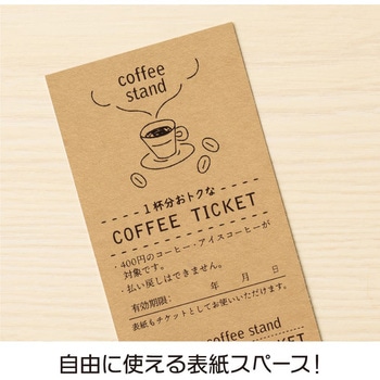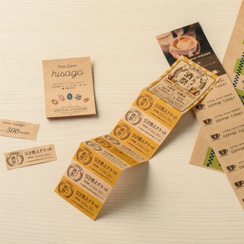用途印刷してから切り離すだけで、綴りタイプのチケット・回数券を少量から作成できます。コーヒー・ドリンクチケットやクリーニング・入浴回数券、イベントチケットなどにおすすめの11枚綴りタイプ。クラフト素材の素朴な風合いがこだわりを演出します。ミシン目入りなので、手で簡単に切り離せます。また、財布やカードケースに入れやすいコンパクトなサイズに折りたたむこともできます。チケットとチケットの間に余白があるので、隣り合うチケット同士を別のデザインにすることも可能!一番上の表紙スペースは、お店の情報やロゴのほか、イベントの詳細など自由にデザインいただけます。両面印刷が可能で、手書きやスタンプにも対応しています。厚さ(mm)0.16寸法(mm)【チケット】55×288(1片:55×21)入数(枚)10シート(チケット30分)対応【プリンタ】カラーレーザー、モノクロレーザー、カラーコピー、モノクロコピー、インクジェット坪量(g/m2)100面付11枚綴り×3面用紙サイズA4(210×297mm)素材クラフト紙RoHS指令(10物質対応)対応内容量1袋(10シート)