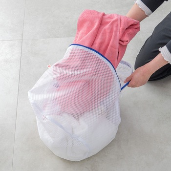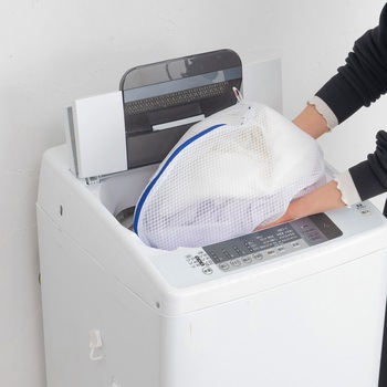まとめ洗い推奨ネット。バスタオル、ブランケット、シングルシーツなどに。型崩れや洗濯シワを抑えます。YKKファスナー使用。ファスナーが開けやすい大きな引き手。掛けて収納しやすいループ状のネームタグ付き。