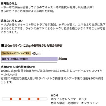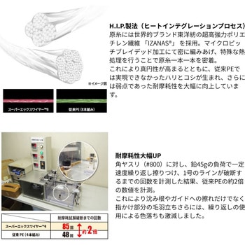 スーパーエックスワイヤーに「エギング専用」新登場!高視認 × 高感度 × 高操作性「H.I.P( ヒートインテグレーションプロセス) 製法」にて原糸同士の密着度を高め、糸に絶妙なハリとコシを実現。ガイド絡み等のトラブルを軽減すると同時に、耐久性アップ。糸潰れしにくく、長時間の使用においても、毛羽立ちや色落ち等の劣化を抑えられます。※真円性が高い為、リールに表記された糸巻量が若干巻けない場合があります。