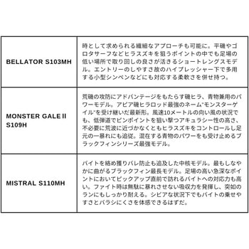 ヒラスズキに完全特化したモデルシリーズBLACKFIN EXIII(ブラックフィン)。グランデージシリーズから外れて独立したというところにアピアの本気度が伺える。 ではなにが違うのか?まずは地磯のランガンや遠征釣行を意識した3ピースに仕立ててあることだ。 なんだ、そんなことかと思うなかれ。継ぎの場所が二か所になるということは強度、曲がり、自重に大きく影響する。だがどうだ、3ピースなのにこの軽さ、この強度、この振り抜け感、ヒラスズキを掛けた時の美しい曲がり。使ってみれば3ピースロッドなのにこんなはず無い…と思うはずだ。 また、掛けてからのレスポンスが激的に向上した。最新カーボン素材を採用している事もあるだろうが、ベリーからバッド部の反発力が素晴らしく、とにかくファイトタイムが短くなり勝負が早い。 そして、俄かには信じられないだろうが、バラシが極端に少ない。昨今の食いが渋く、ショートバイトの多いヒラスズキだが、バラシ率が減りキャッチ率が上がるとは思いもよらなかった事案だ。 用意されたのは三機種。ショートレングスを活かした早い手返しさで攻めるベラトールか、時に中型青物とも対峙でき、楽にヒラスズキ抜き上げるパワーを持つモンスターゲイル?か、正確なアキュラシーを誇るミストラルか。刻一刻と変わるロックショアの波風に合わせてチョイスしたい。
