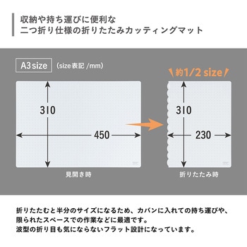用途必要最低限のデザインでありながら実用的に使用できるカッティングマット本体質量(g)255寸法(横×縦×厚さ)(mm)(見開き)450×310×2、(二つ折り)230×310×4内容量1枚