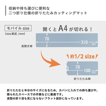 筆記具、カッター等と一緒に持ち運べるサイズ感。オフィスワーク、ホビー、学生の工作にも便利。小さくても実用性ばっちり、A4用紙(297x210mm)もカット可能です。直角がわかりやすい格子罫線と、邪魔にならないドット罫線のいいとこどりの「十字罫線」仕様。環境に配慮した「再生オレフィン系樹脂」を使用しています。