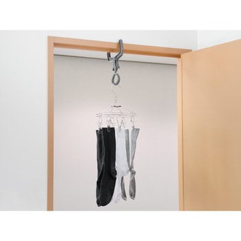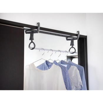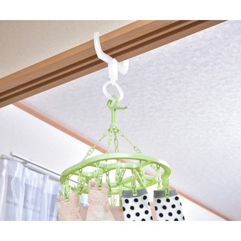 部屋干しカンタン便利アイテム、花粉・黄砂・PM2.5対策に、雨の日や外出時の部屋干しに、ドア枠やかもいに掛けるだけ、便利な回転式リングフックで使い方いろいろ、2個使用ならポールを通して物干し場が作れます