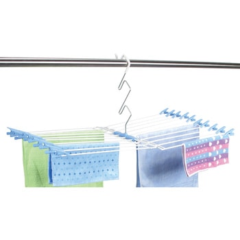 特殊フックで高さ3段階調整、クリップが付いた20本アームでたくさん干せる、上段フックは高いところ、下段フックは低竿に対応、庭・テラス・軒下・室内どこにも使えます