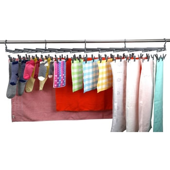 干す場所・干す物に伸縮自在に対応、長~く使って小さく収納、短いフックで竿にしっかり固定、低竿対応、長めの洗濯物も干しやすい、ピンチ59個付き